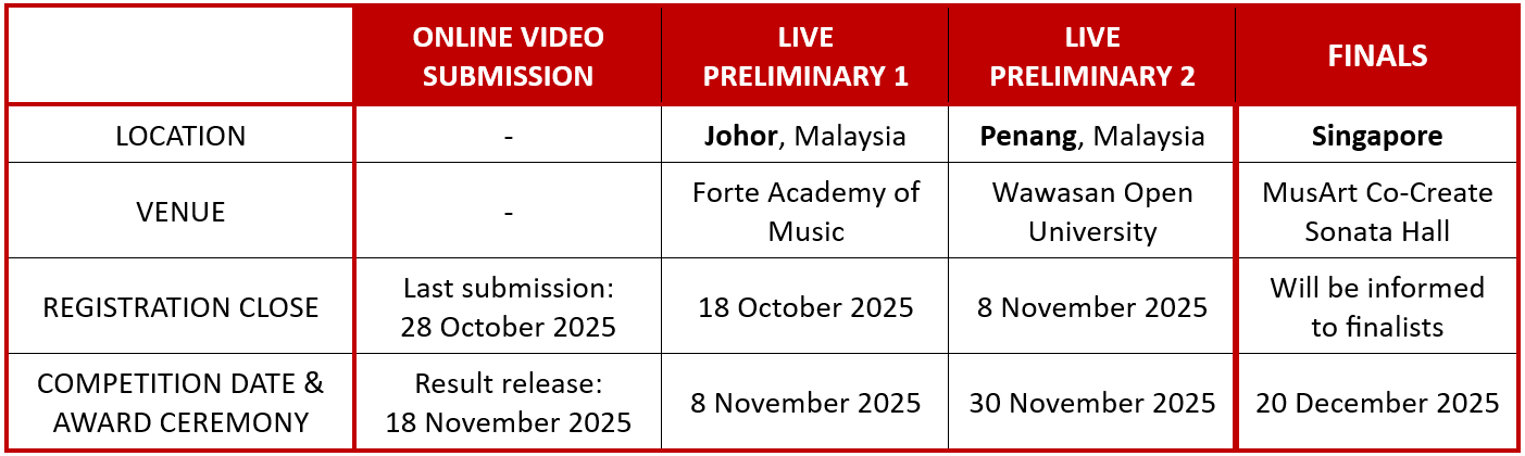 For solo performance, teachers of 1st Prize, 2nd Prize, 3rd Prize, Platinum, Gold and Silver achievers will receive a certificate. For group, certificate will be awarded to the leader/conductor/manager/teacher’s name submitted during registration.