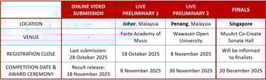Backing track is allowed ONLY for Age categories “4 years and below” and “5 - 6 years”. If performing two pieces with backing tracks, both backing tracks must be combined into one single audio file. Please rename the audio file to participant’s full name and category.